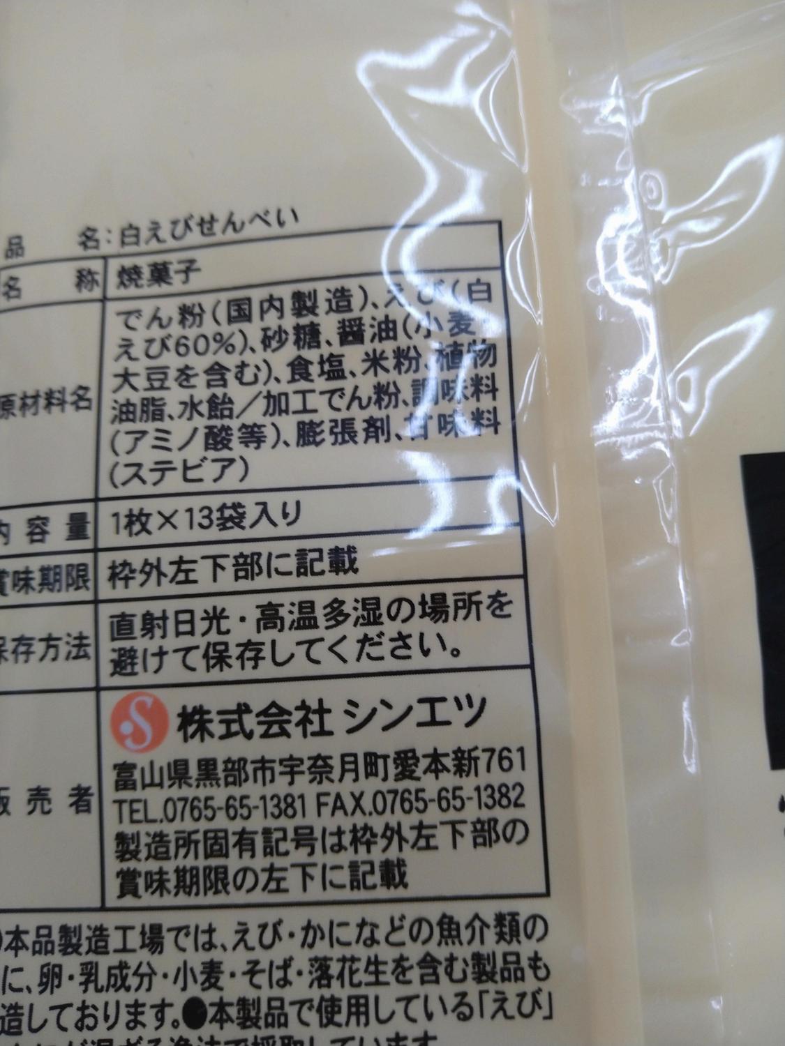 原材料:でん粉(国内製造)、えび(白えび60%)、砂糖、醤油(小麦・大豆を含む)、食塩、米粉、植物油脂、水飴/加工でん粉、調味料(アミノ酸等)、膨張剤、甘味料(ステビア)