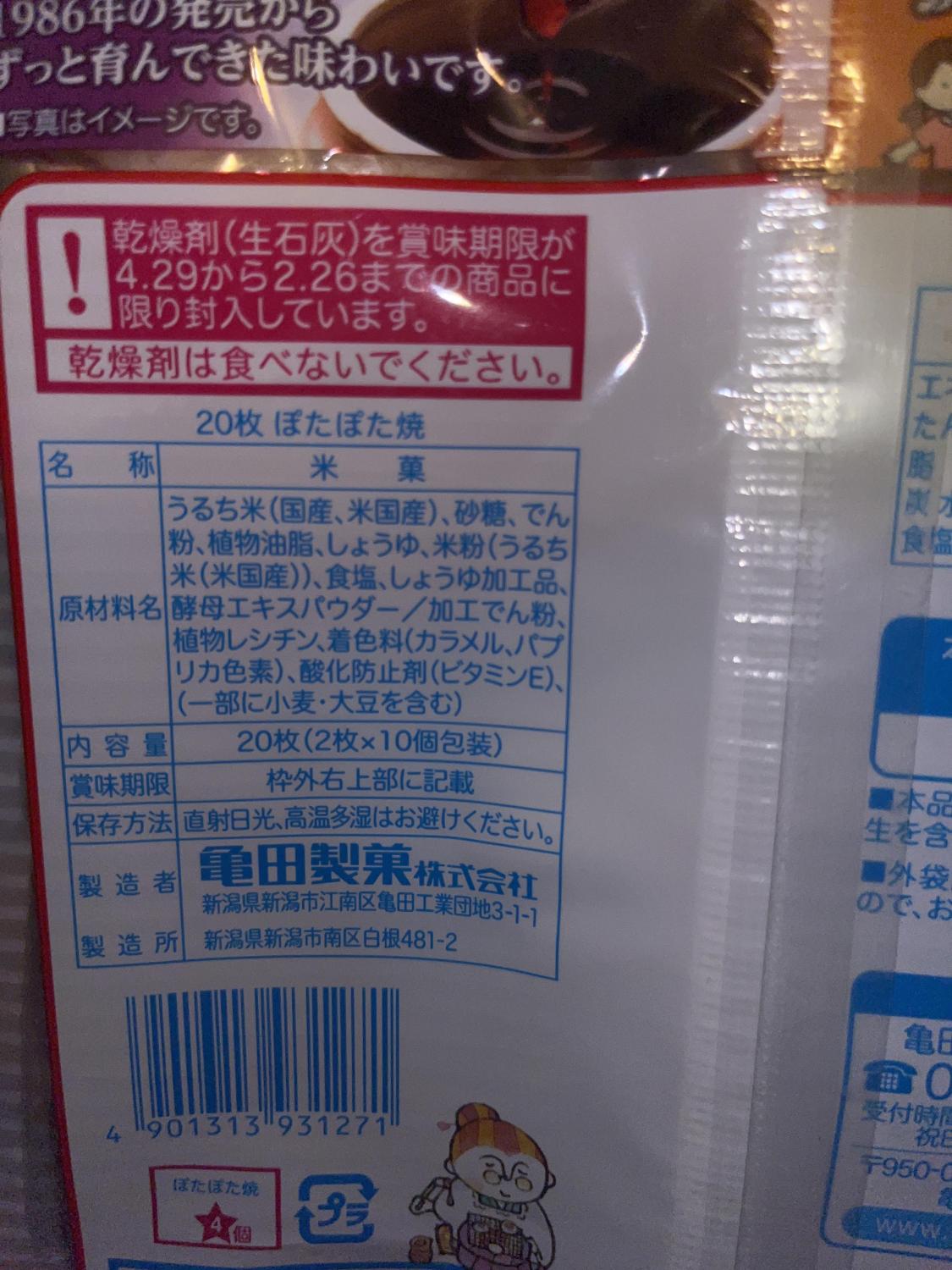 名称米菓原材料名うるち米(国産、米国産)、砂糖、でん粉、植物油脂、しょうゆ、米粉(うるち米(米国産))、食塩、しょうゆ加工品、酵母エキスパウダー添加物加工でん粉、植物レシチン、着色料(カラメル、パプリカ色素)、酸化防止剤(ビタミンE)内容量20枚 (2枚×10個包装)詳細を見る