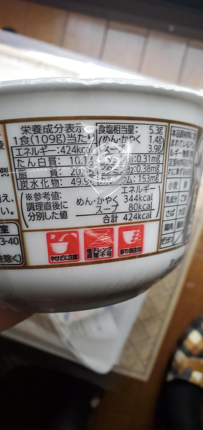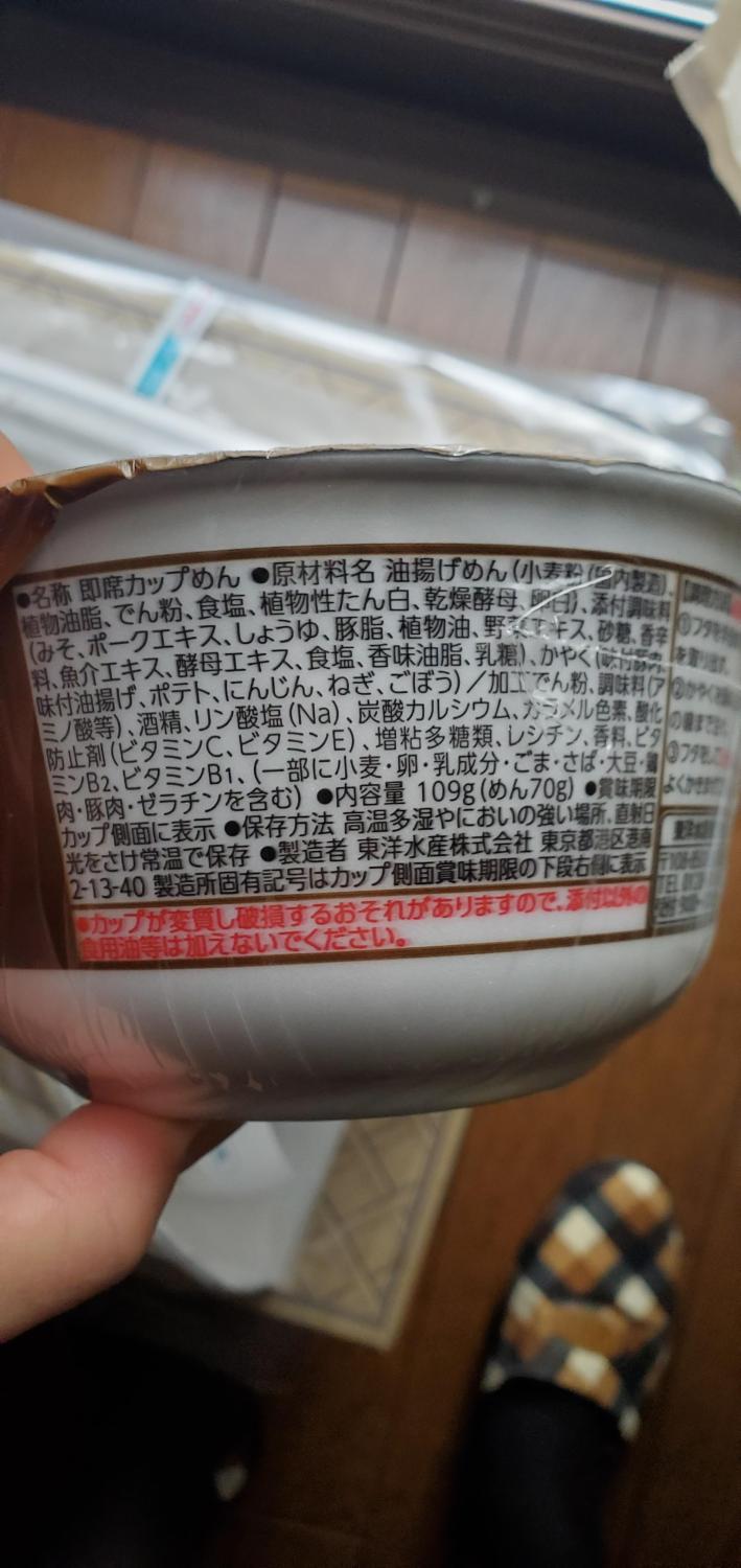 名称即席カップめん原材料名油揚げめん(小麦粉(内製植物油脂、でん粉、食塩、植物性たん白、乾燥酵母、日)、調味料(みそ、ポークエキス、しょうゆ、豚脂、植物油、野菜キス、砂糖、香辛料、魚介エキス、酵母エキス、食塩、香味油脂、乳糖)、かやく味付油揚げ、ポテト、にんじん、ねぎ、ごぼう添加物加工でん粉、調味料(アミノ酸等)、酒精、リン酸塩(Na)、炭酸カルシウム、カラメル色素、酸化防止剤(ビタミンC、ビタミンE)、増粘多糖類、レシチン、香料、ビタミンB2、ビタミンB1内容量109g(めん70g)詳細を見る