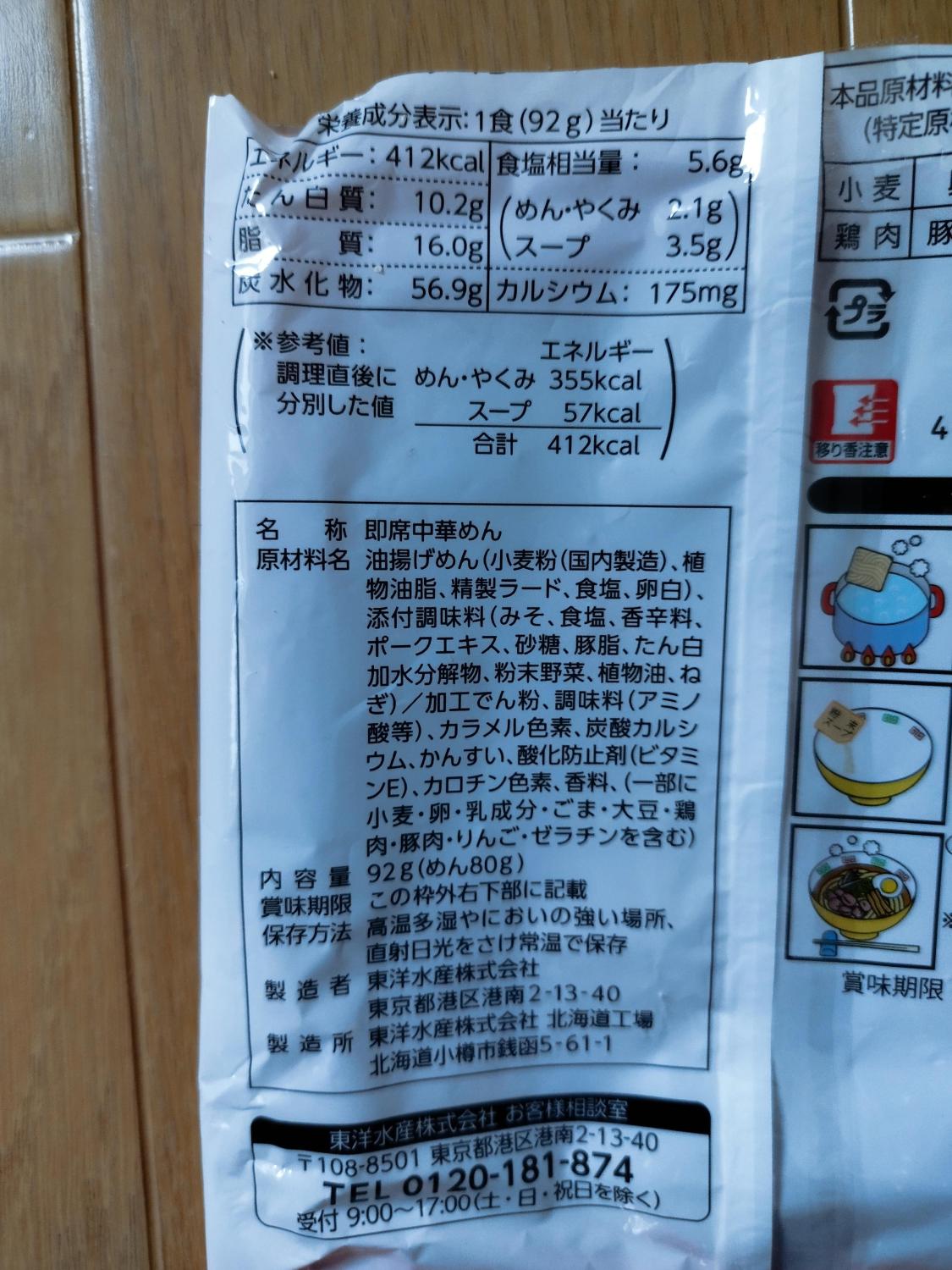 名称即席中華めん原材料名油揚げめん(小麦粉(国内製造)、植物油脂、精製ラード、食塩、卵白)、添付調味料(みそ、食塩、香辛料、ポークエキス、砂糖、豚脂、たん白加水分解物、粉末野菜、植物油、ねぎ)添加物加工でん粉、調味料(アミノ酸等)、カラメル色素、炭酸カルシウム、かんすい、酸化防止剤(ビタミンE)、カロチン色素、香料内容量92g(めん80g)詳細を見る