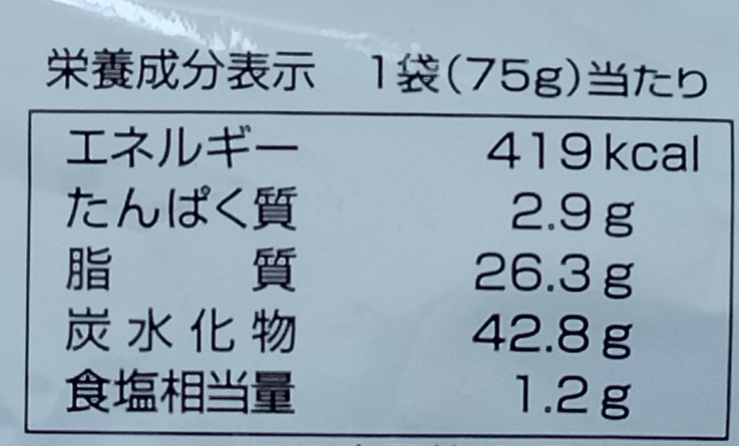 食品単位1袋(75g)当たりエネルギー419kcalタンパク質2.9g脂質26.3g炭水化物42.8g食塩相当量1.2g詳細を見る