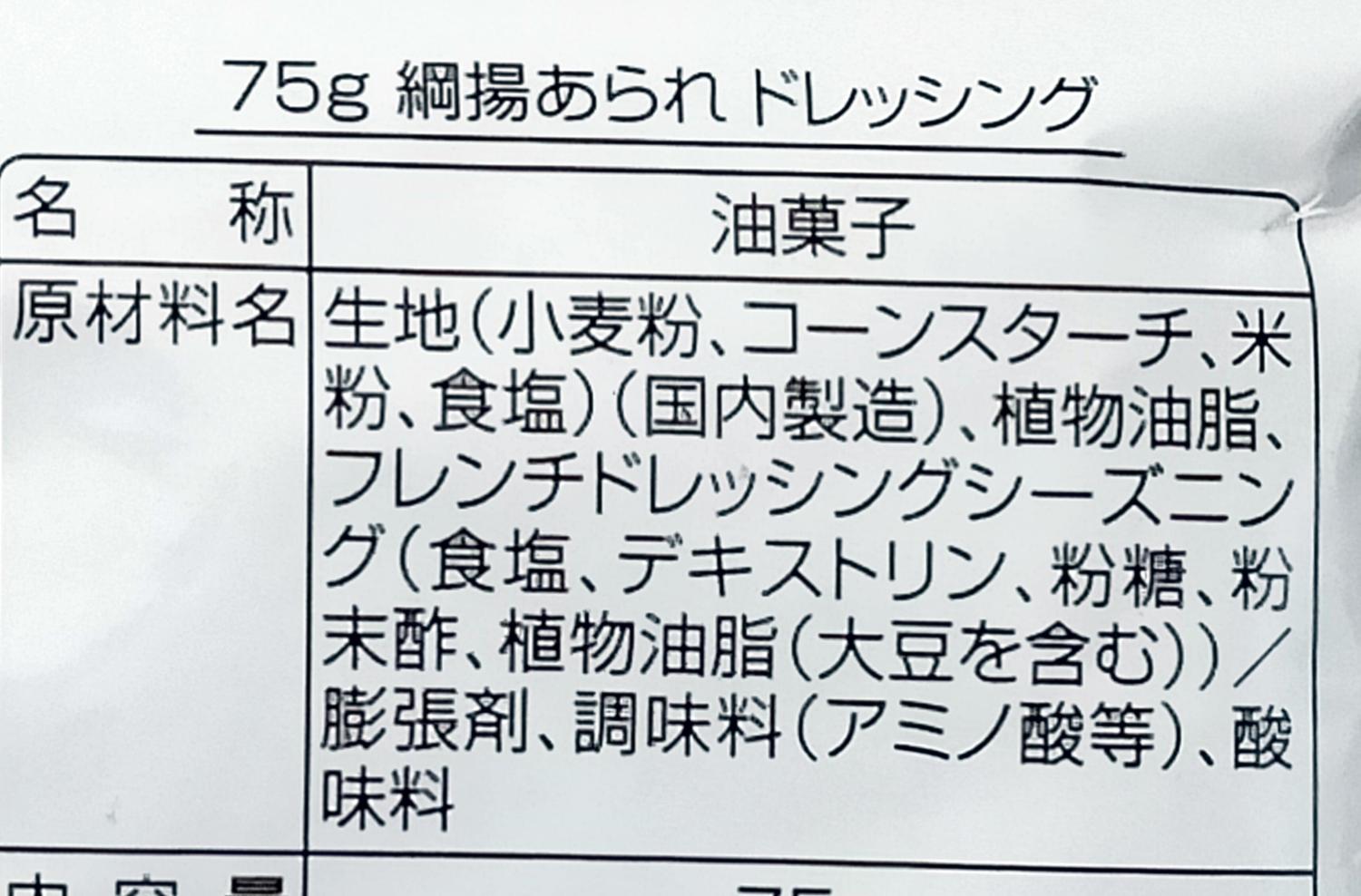 名称油菓子原材料名生地(小麦粉、コーンスターチ、米粉、食塩)(国内製造)、植物油脂、フレンチドレッシングシーズニング(食塩、デキストリン、粉糖、粉末酢、植物油脂(大豆を含む))添加物膨張剤、調味料(アミノ酸等)、酸味料詳細を見る