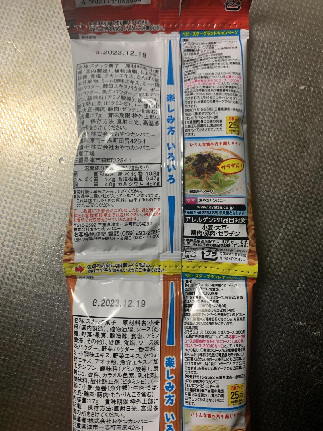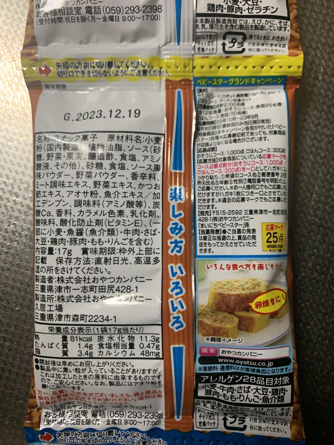 名称スナック菓子原材料名小麦粉(国内製造)、植物油脂、ソース(砂糖、野菜・果実、醸造酢、食塩、アミノ酸液、その他)、砂糖、食塩、ソース風味パウダー、野菜パウダー、香辛料、ミート調味エキス、野菜エキス、かつお節エキス、アオサ粉、魚介エキス添加物加工デンプン、調味料(アミノ酸等)、炭酸Ca、香料、カラメル色素、乳化剤、酸味料、酸化防止剤(ビタミンE)内容量17g保存方法直射日光、高温多湿の所をさけてください。製造者株式会社おやつカンパニー製造所株式会社おやつカンパニー久居工場栄養成分表示81kcal、1.4g、3.4g、11.3g、0.47g、48mg詳細を見る