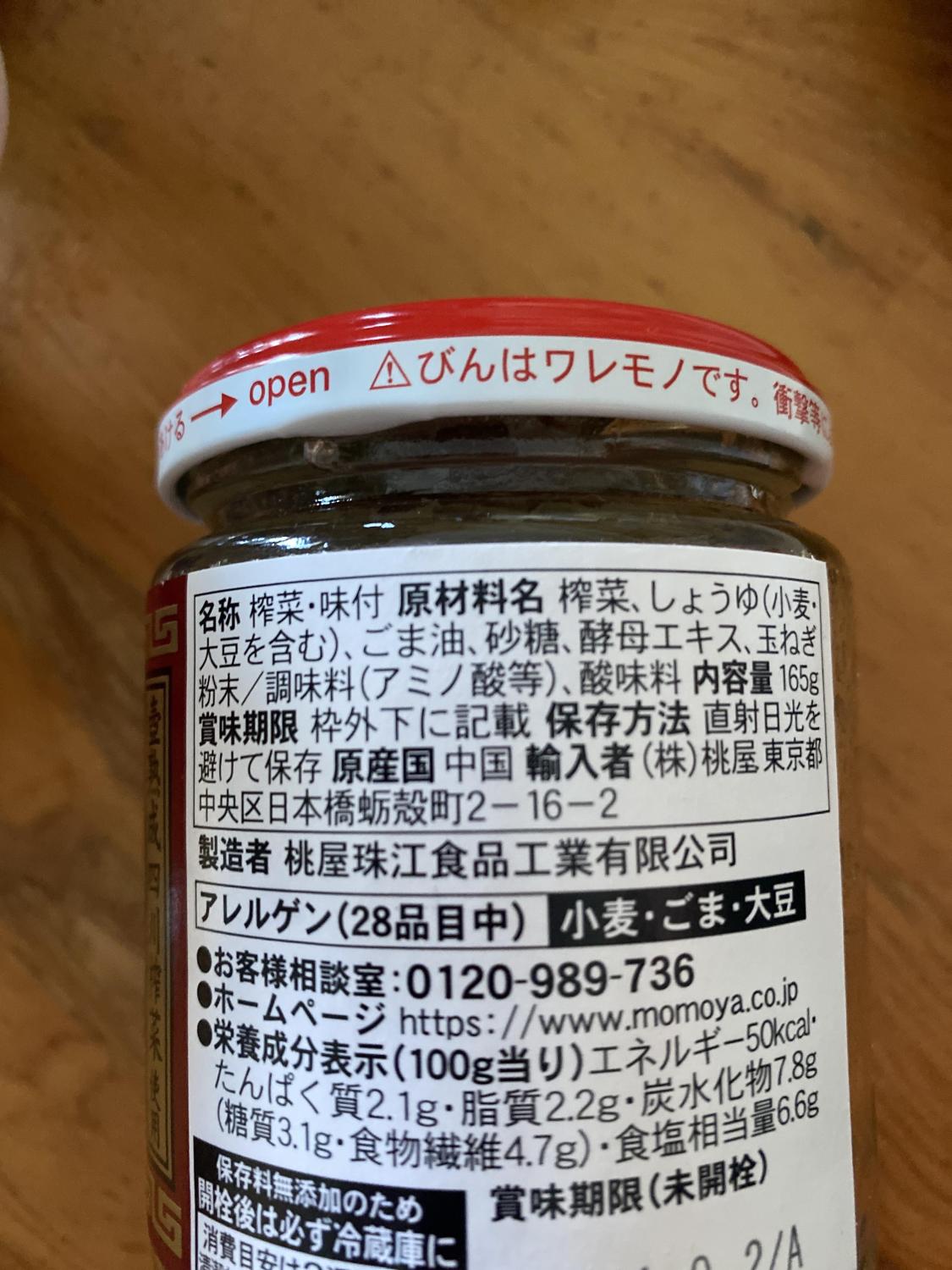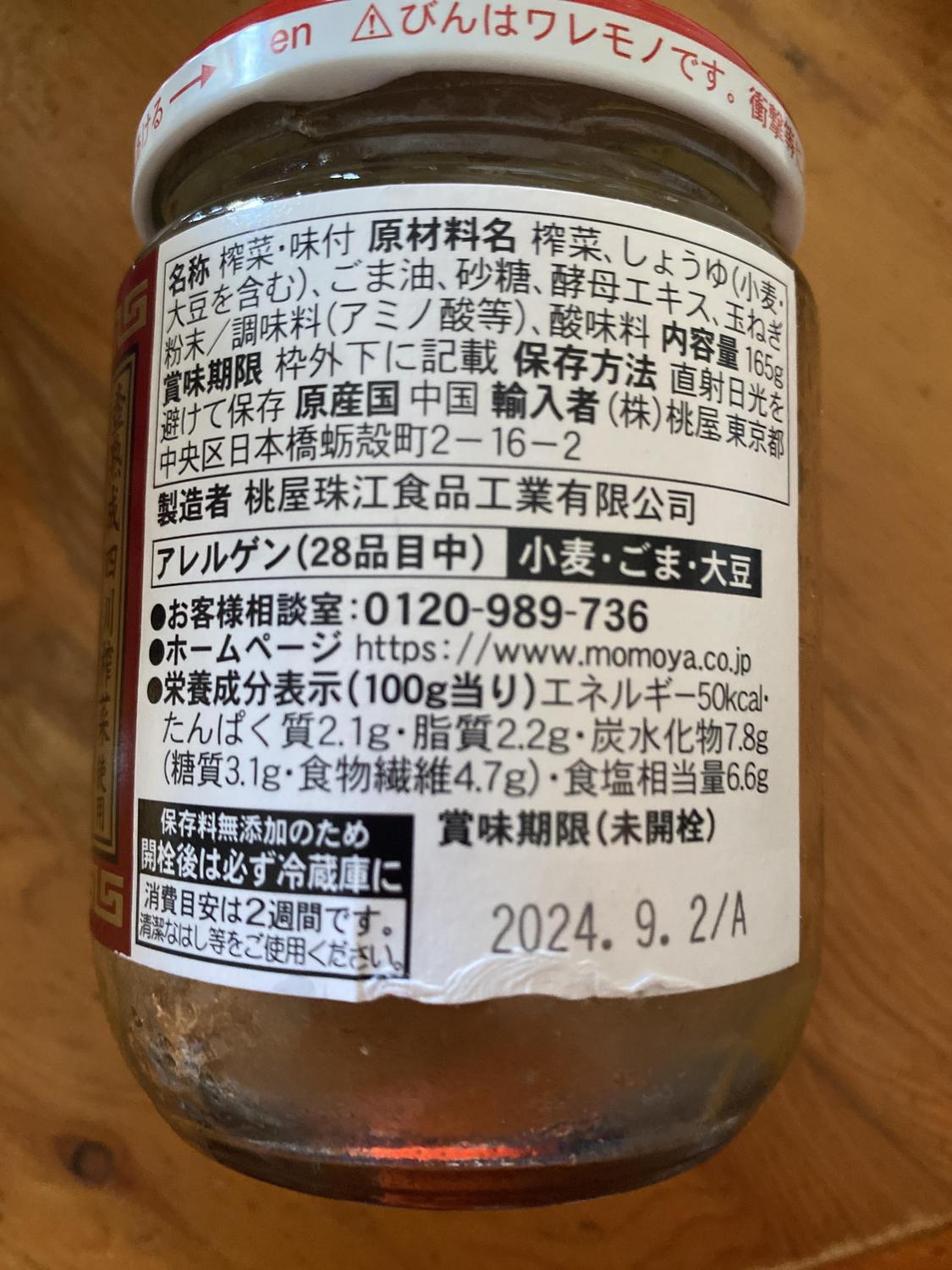 名称搾菜・味付原材料名搾菜、しょうゆ(小麦・大豆を含む)、ごま油、砂糖、酵母エキス、玉ねぎ粉末添加物調味料(アミノ酸等)、酸味料内容量165g原産国中国輸入者(株)桃屋 東京都中央区日本橋蛎殻町2-16-2製造者桃屋珠江食品工業有限公司アレルゲン小麦、ごま、大豆栄養成分表示50kcal、2.1g、2.2g、7.8g、3.1g、4.7g、6.6g詳細を見る