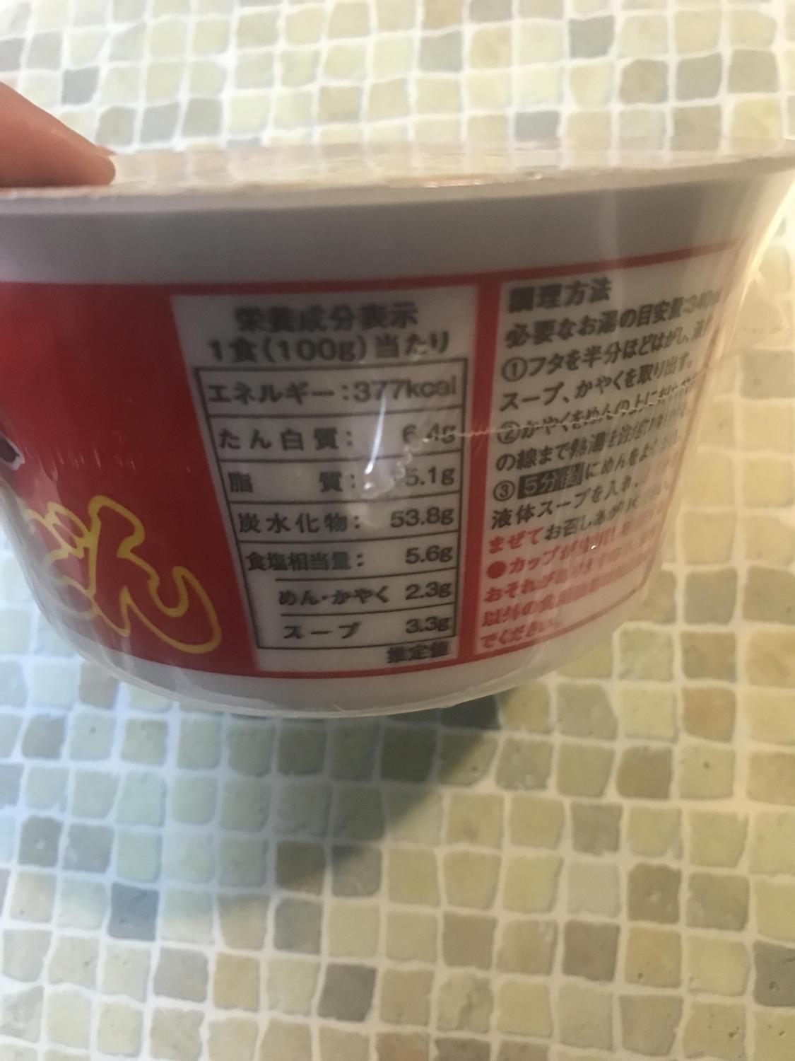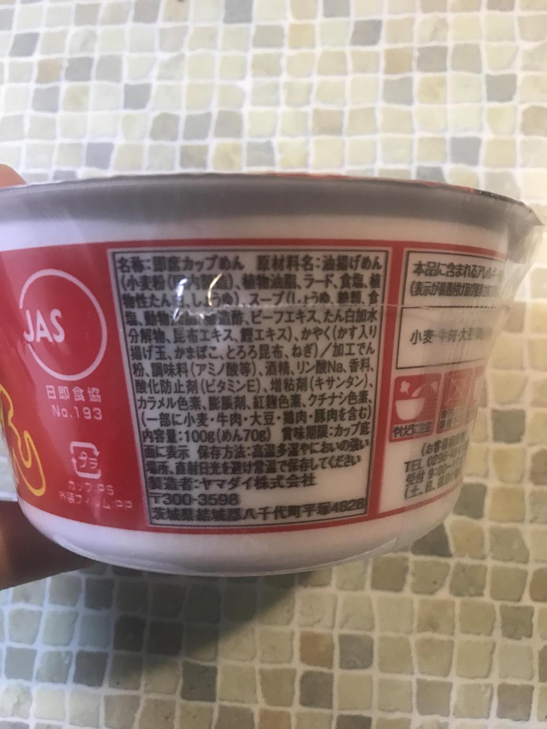 原材料 : 油揚げめん(小麦粉(国内製造)、植物油脂、ラード、食塩、植物性たん白、しょうゆ)、スープ(しょうゆ、糖類、食塩、動物油脂、ビーフエキス、たん白加水分解物、昆布エキス、鰹エキス)、かやく(かす入り揚げ玉、とろろ昆布、かまぼこ、ねぎ)/加工でん粉、調味料(アミノ酸等)、酒精、リン酸Na、香料、増粘剤(キサンタン)、酸化防止剤(ビタミンE)、カラメル色素、膨脹剤、紅麹色素、クチナシ色素、(一部に小麦・牛肉・大豆・鶏肉・豚肉を含む)