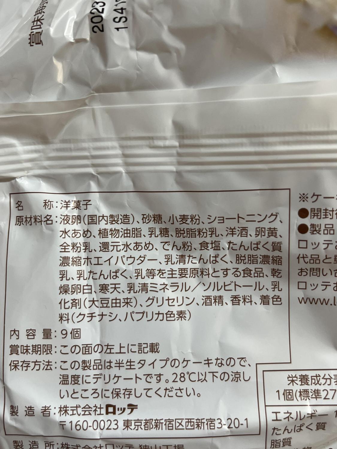 名称洋菓子原材料名液卵(国内製造)、砂糖、小麦粉、ショートニング、水あめ、植物油脂、乳糖、脱脂粉乳、洋酒、卵黄、全粉乳、還元水あめ、でん粉、食塩、たんぱく質濃縮ホエイパウダー、乳清たんぱく、脱脂濃縮乳乳たんぱく、乳等を主要原料とする食品、乾燥卵白、寒天、乳清ミネラル添加物ソルビトール、乳化剤(大豆由来)、グリセリン、酒精、香料、着色料(クチナシ、パプリカ色素)内容量9個保存方法28℃以下の涼しいところに保存してください。製造者株式会社ロッテ製造所株式会社ロッテ 徳山詳細を見る