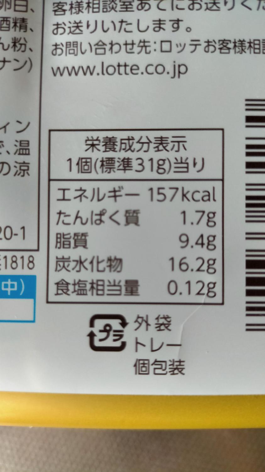食品単位1個(標準31g)当たりエネルギー157kcalタンパク質1.7g脂質9.4g食塩相当量0.12g炭水化物16.2g詳細を見る
