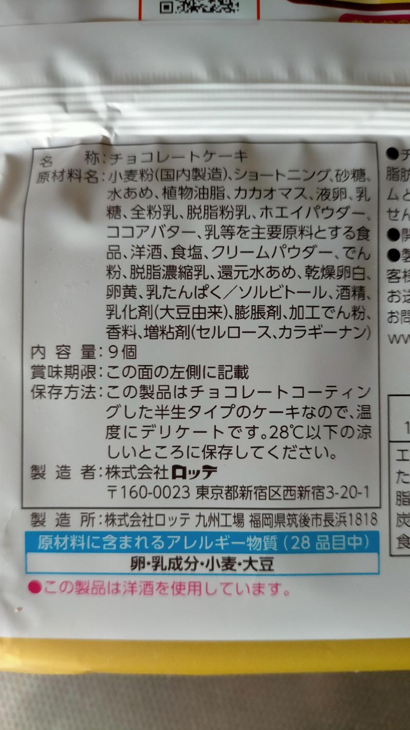 名称チョコレートケーキ原材料名小麦粉(国内製造)、ショートニング、砂糖、脂肪水あめ、植物油脂、カカオマス、液卵、乳糖、全粉乳、脱脂粉乳、ホエイパウダー、せんココアバター、乳等を主要原料とする食品、洋酒、食塩、クリームパウダー、でん粉、脱脂濃縮乳、還元水あめ、乾燥卵白、客卵黄、乳たんぱく添加物ソルビトール、酒精、乳化剤(大豆由来)、膨脹剤、加工でん粉、香料、増粘剤(セルロース、カラギーナン)内容量9個保存方法28℃以下の涼しいところに保存してください。製造者株式会社ロッテ製造所株式会社ロッテ 九州工場 福岡県筑後市長浜1818アレルギー物質卵、乳成分、小麦、大豆詳細を見る