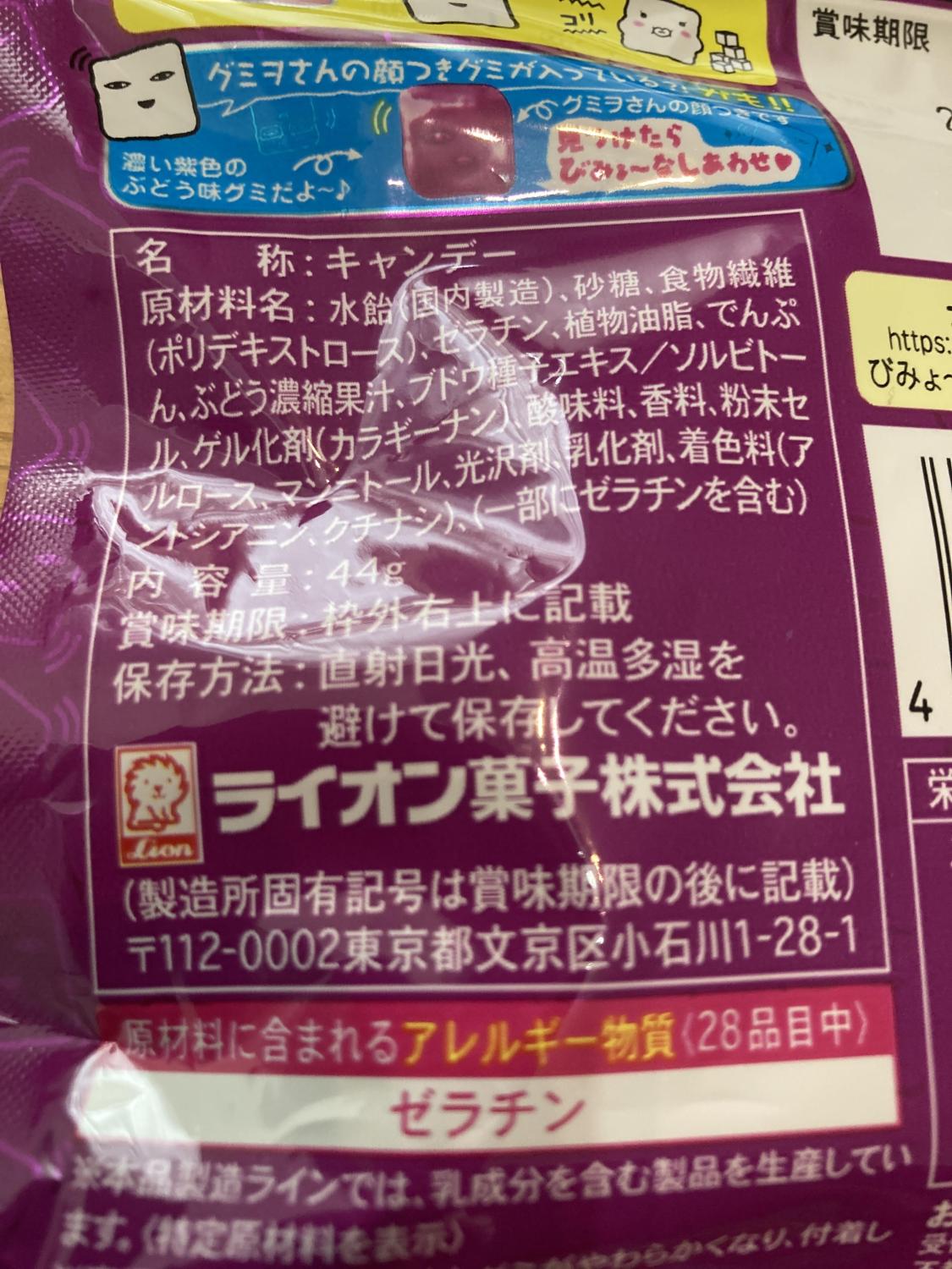 名称キャンデー原材料名水飴(国内製造)、砂糖、食物繊維(ポリデキストロース)、ゼラチン、植物油脂、でんぷん、ぶどう濃縮果汁、ブドウ種子エキス添加物ソルビトール、ゲル化剤(カラギーナン)、酸味料、香料、粉末セルロース、マンニトール、光沢剤、乳化剤、着色料(アントシアニン、クチナシ)内容量44g保存方法直射日光、高温多湿を避けて保存してください。アレルギー物質ゼラチン詳細を見る