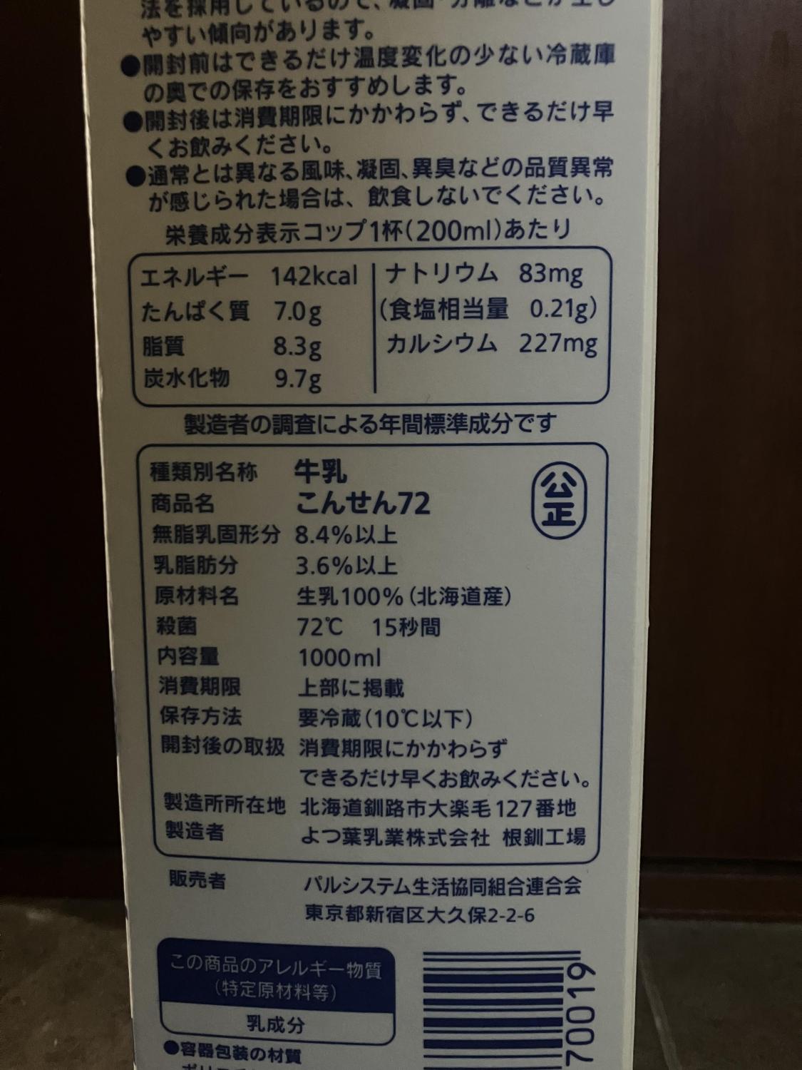 種類別名称牛乳商品名こんせん72無脂乳固形分8.4%以上乳脂肪分3.6%以上原材料名生乳100% (北海道産)内容量1000ml消費期限上部に掲載保存方法要冷蔵(10℃以下)製造所所在地北海道釧路市大楽毛127番地製造者よつ葉乳業株式会社 根釧工場販売者パルシステム生活協同組合連合会 東京都新宿区大久保2-2-6アレルギー物質乳成分栄養成分表示142kcal、83mg、0.21g、7.0g、8.3g、227mg、9.7g詳細を見る