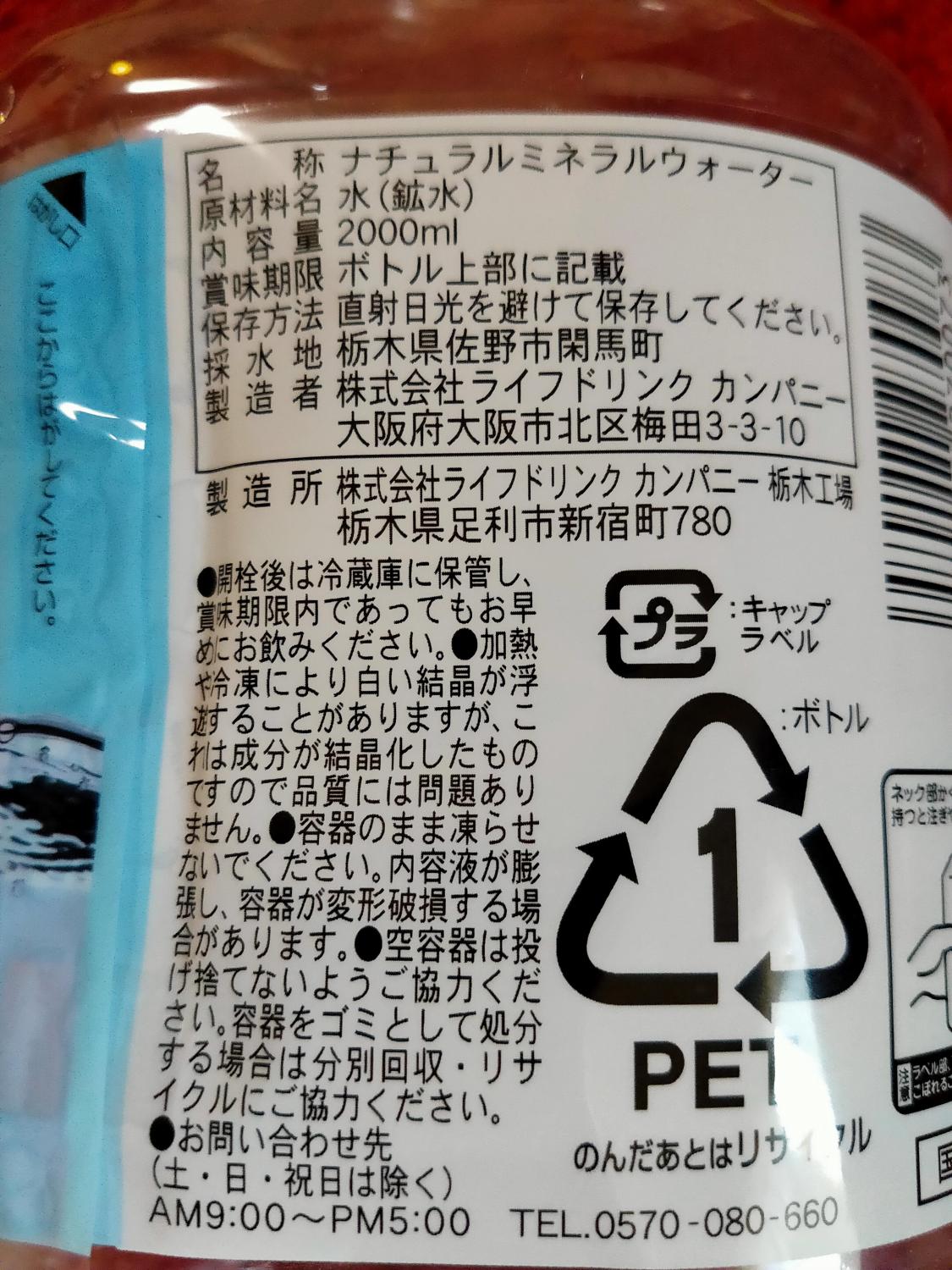 名称ナチュラルミネラルウォーター原材料名水(鉱水)内容量2000ml保存方法直射日光を避けて保存してください。製造者株式会社ライフドリンクカンパニー製造所株式会社ライフドリンクカンパニー栃木工場詳細を見る