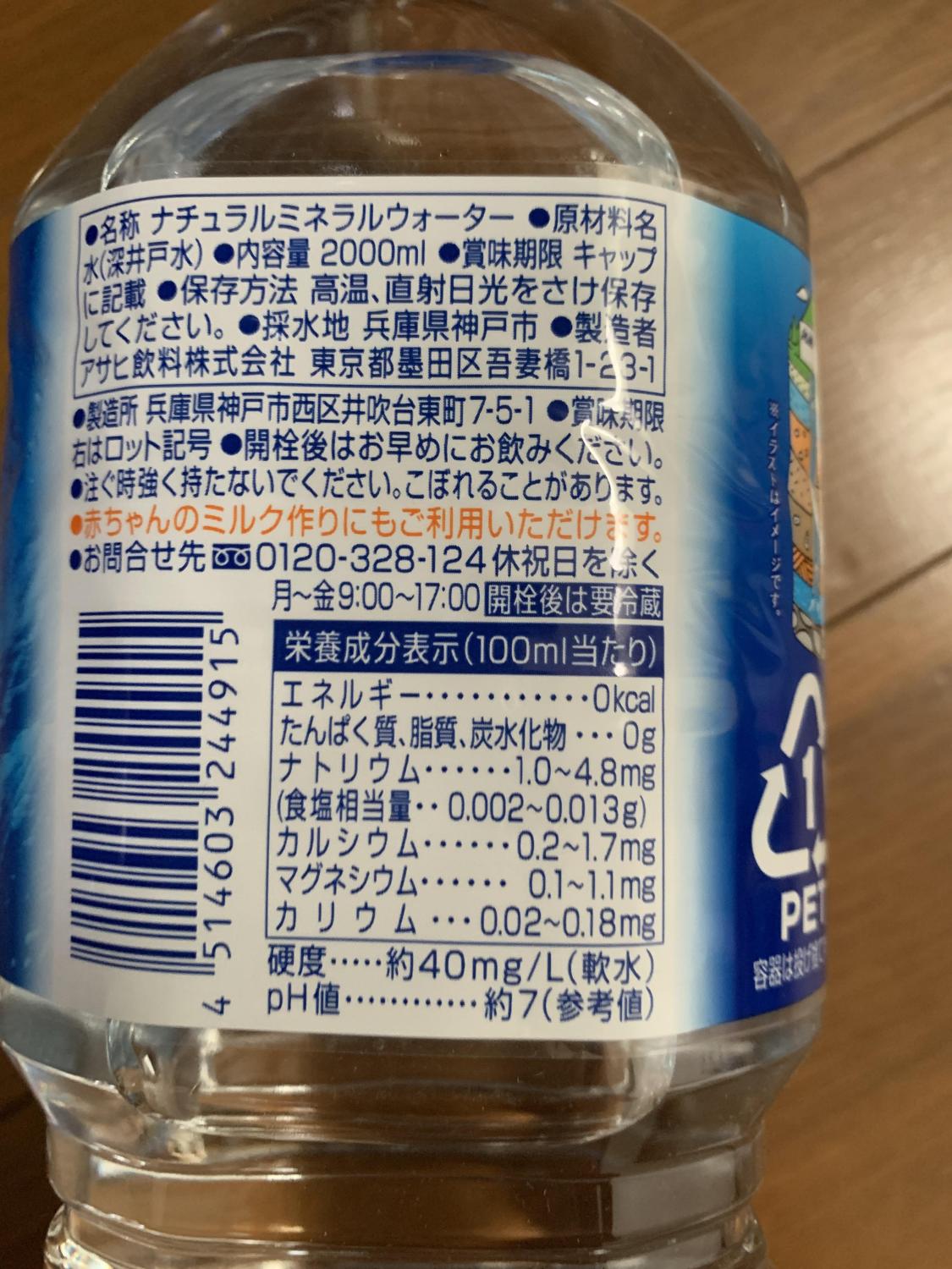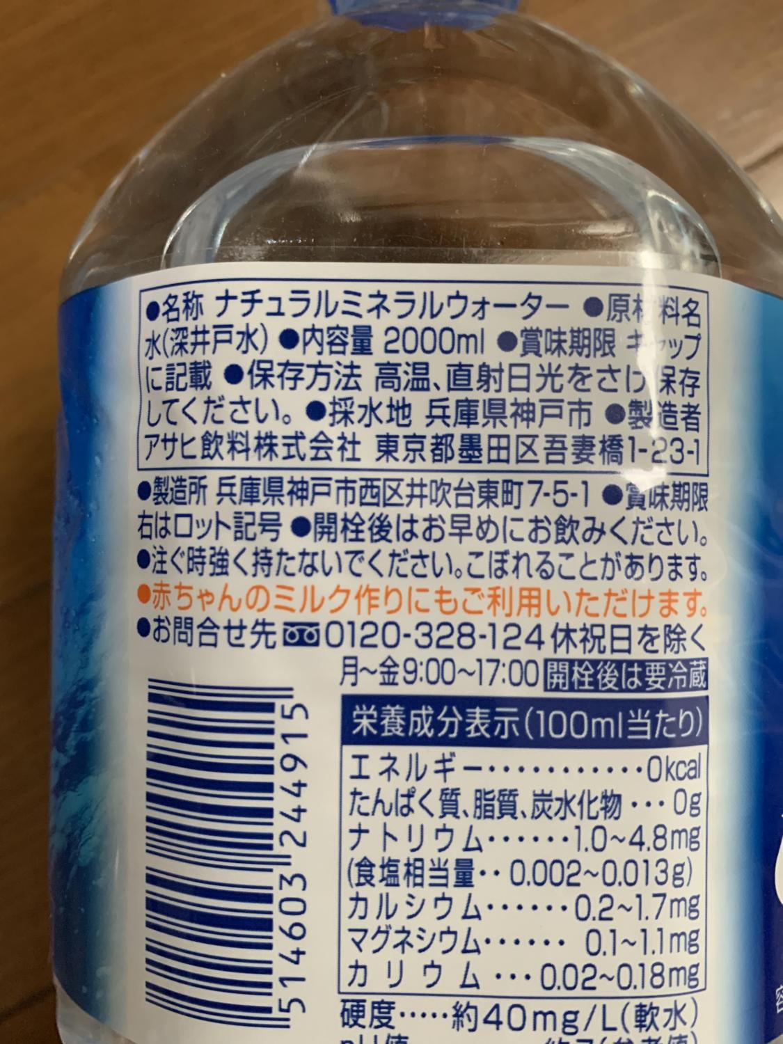 名称ナチュラルミネラルウォーター原材料名水(深井戸水)内容量2000ml採水地兵庫県神戸市製造者アサヒ飲料株式会社 東京都墨田区吾妻橋1-23-1製造所兵庫県神戸市西区井吹台東町7-5-1栄養成分表示0kcal、0g、0g、0g、1.0~4.8mg、0.002~0.013g、0.2~1.7mg、0.1~1.1mg、0.02~0.18mg、約40mg/L(軟水)詳細を見る