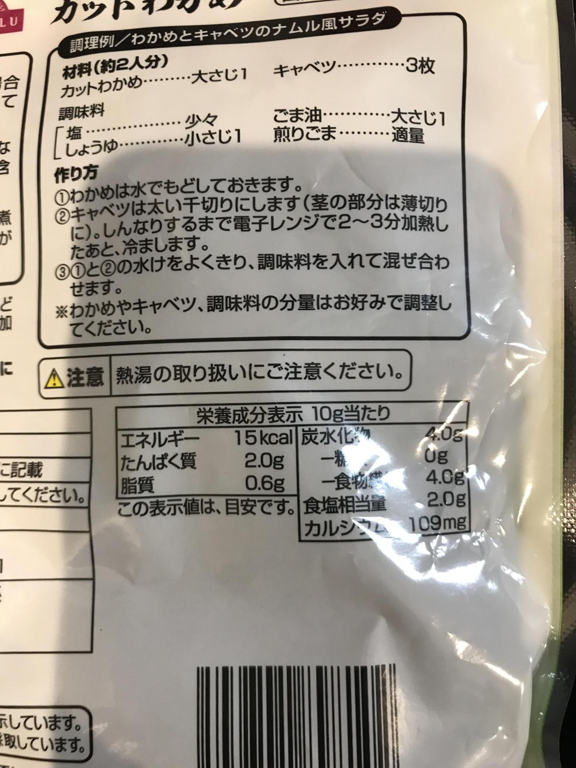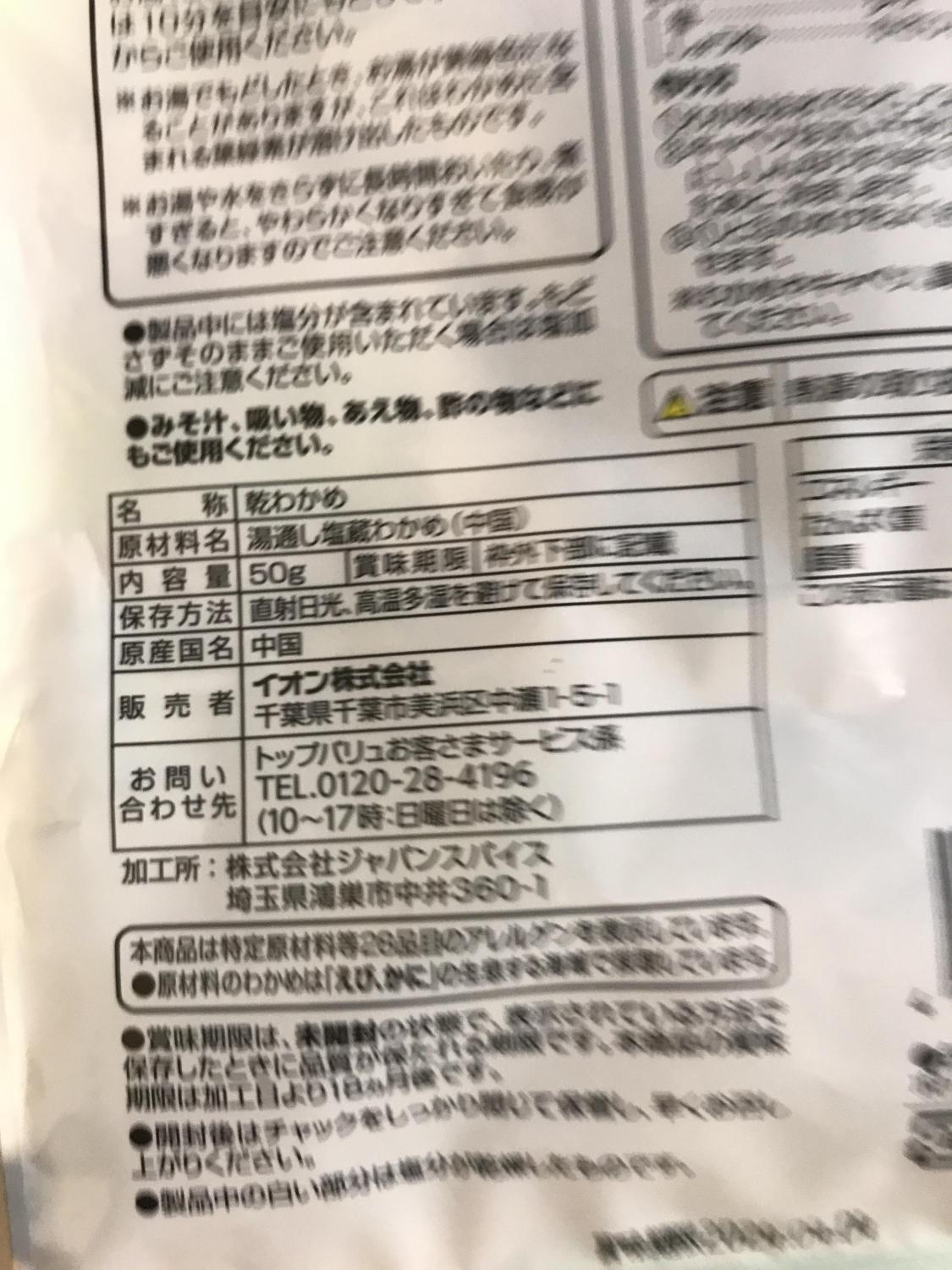 名称乾わかめ原材料名湯通し塩蔵わかめ(中国)内容量50g賞味期限枠外下部に記載保存方法直射日光、高温多湿を避けて保原産国名中国販売者イオン株式会社販売者住所千葉県千葉市美浜区中瀬1-5-1お問い合わせ先TEL.0120-28-4196 (10~17時: 日曜日は...加工所株式会社ジャパンスパイス加工所住所埼玉県鴻巣市中井360-1詳細を見る