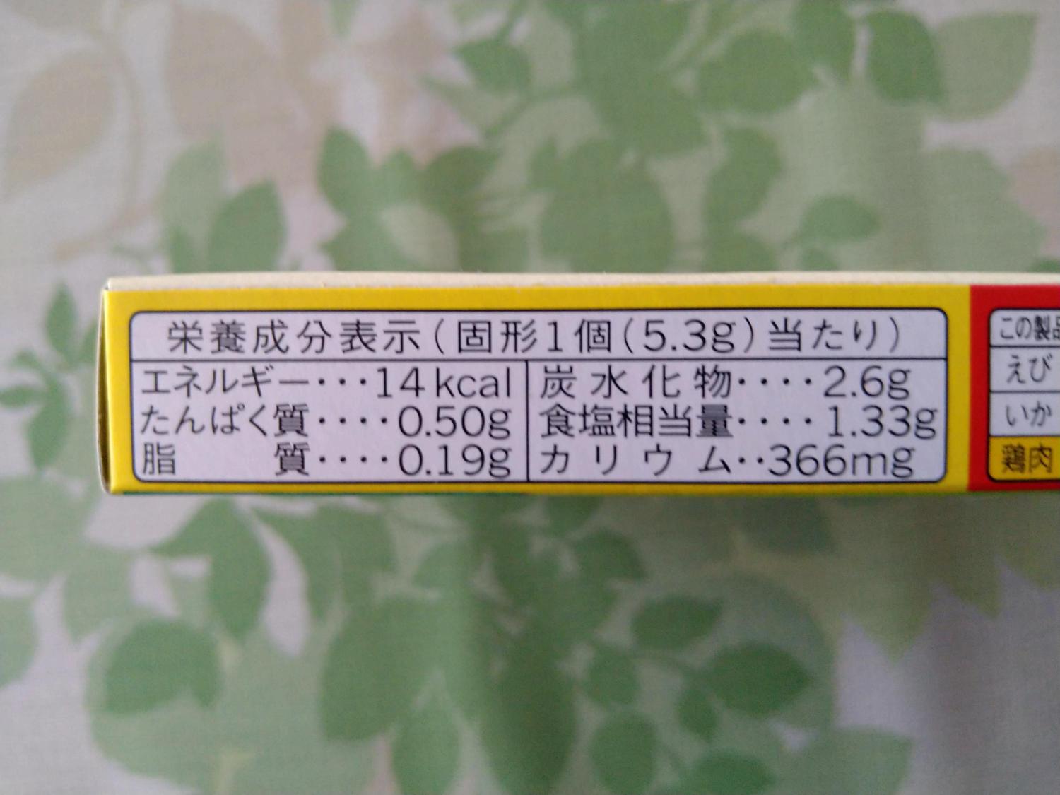 食品単位固形1個(5.3g)当たりエネルギー14kcalタンパク質0.50g脂質0.1g食塩相当量1.3g炭水化物2.6gカリウム366mg詳細を見る