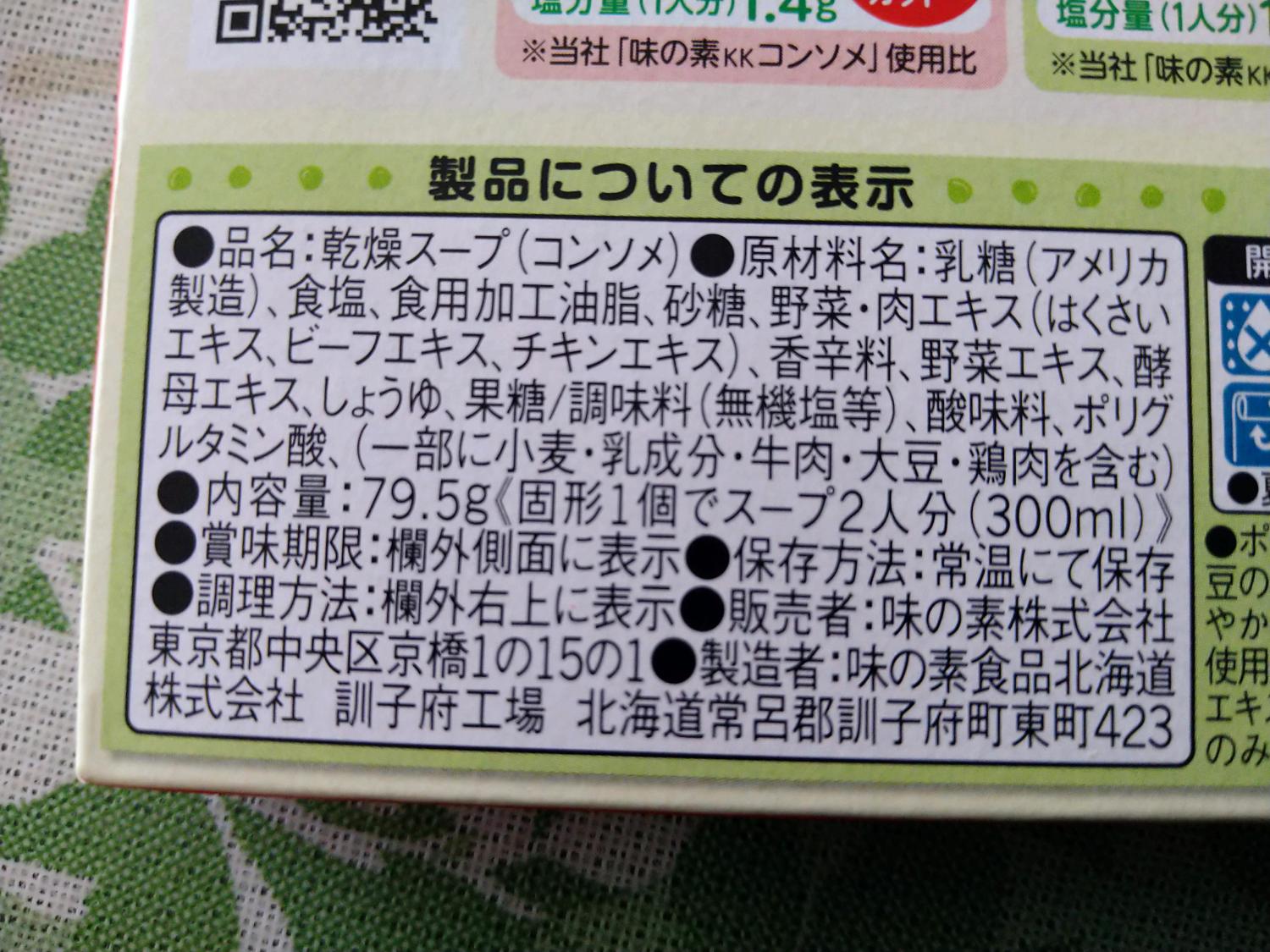 品名乾燥スープ (コンソメ)原材料名乳糖 (アメリカ製造)、食塩、食用加工油脂、砂糖、野菜・肉エキス(はくさいエキス、ビーフエキス、チキンエキス)、香辛料、野菜エキス、酵母エキス、しょうゆ、果糖添加物調味料 (無機塩等)、酸味料、ポリグルタミン酸内容量79.5g販売者味の素株式会社製造者味の素食品北海道株式会社 訓子府工場詳細を見る