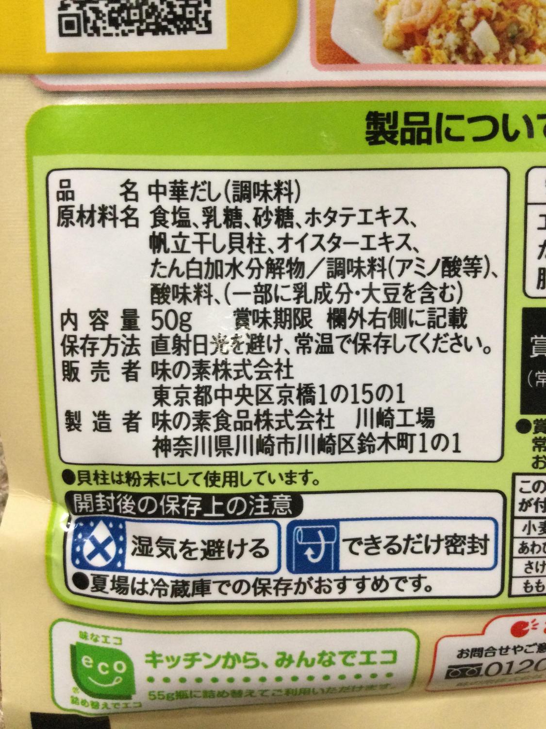 名称中華だし(調味料)原材料名食塩、乳糖、砂糖、ホタテエキス、帆立干し貝柱、オイスターエキス、たん白加水分解物添加物調味料(アミノ酸等)、酸味料内容量50g保存方法直射日光を避け、常温で保存してください。販売者味の素株式会社製造者味の素食品株式会社 川崎工場詳細を見る