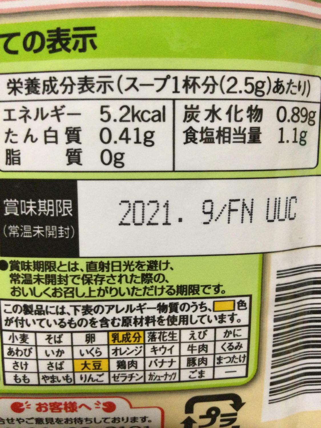 食品単位スープ1杯分(2.5g)あたりエネルギー5.2kcalタンパク質0.41g脂質0g食塩相当量1.1g炭水化物0.89g詳細を見る
