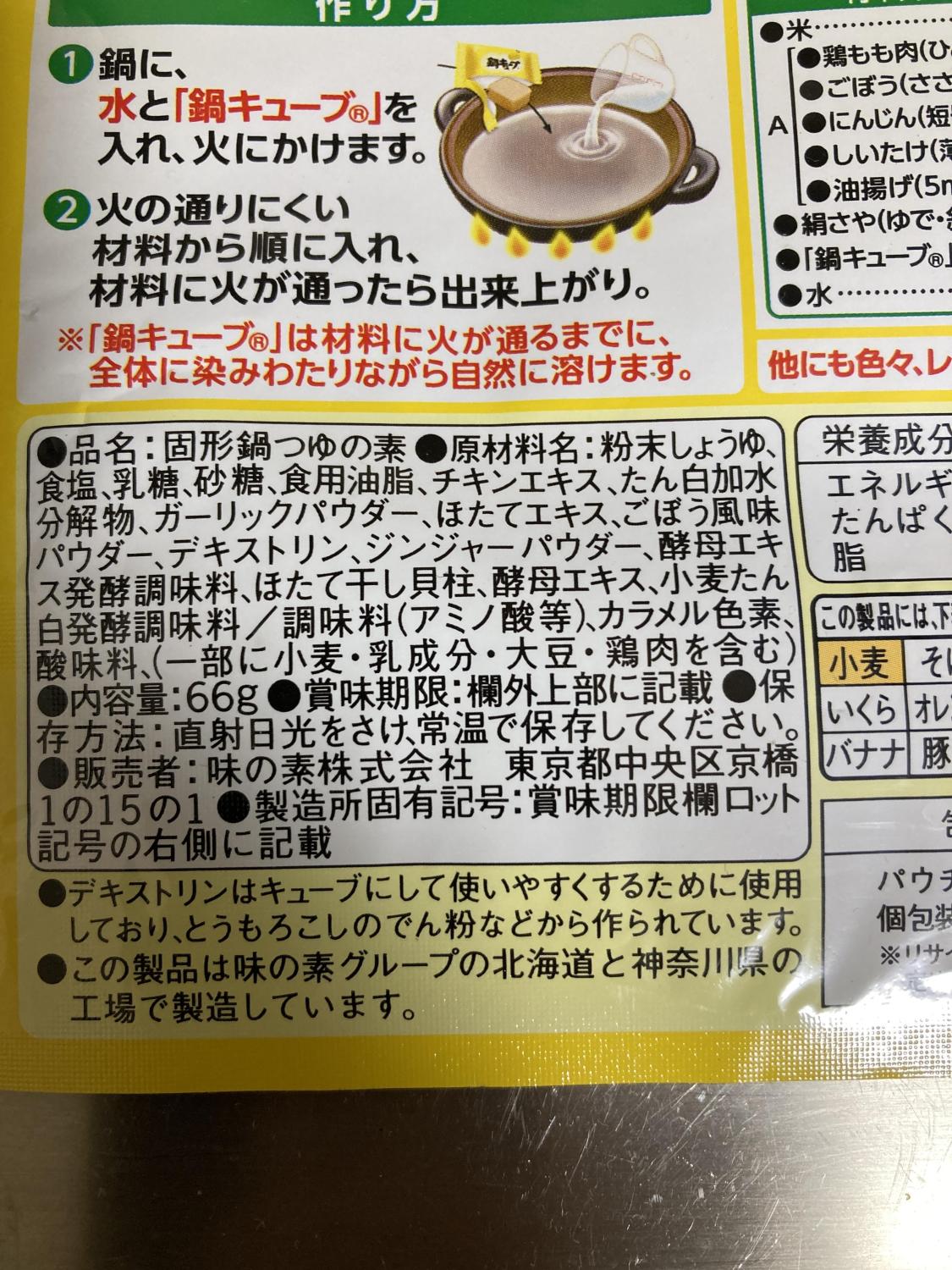 品名固形鍋つゆの素原材料名粉末しょうゆ、食塩、乳糖、砂糖、食用油脂、チキンエキス、たん白加水分解物、ガーリックパウダー、ほたてエキス、ごぼう風味たんぱくパウダー、デキストリン、ジンジャーパウダー、酵母エキス発酵調味料、ほたて干し貝柱、酵母エキス、小麦たん白発酵調味料添加物調味料(アミノ酸等)、カラメル色素、酸味料内容量66g保存方法直射日光をさけ、常温で保存してください。販売者味の素株式会社 東京都中央区京橋1の15の1詳細を見る