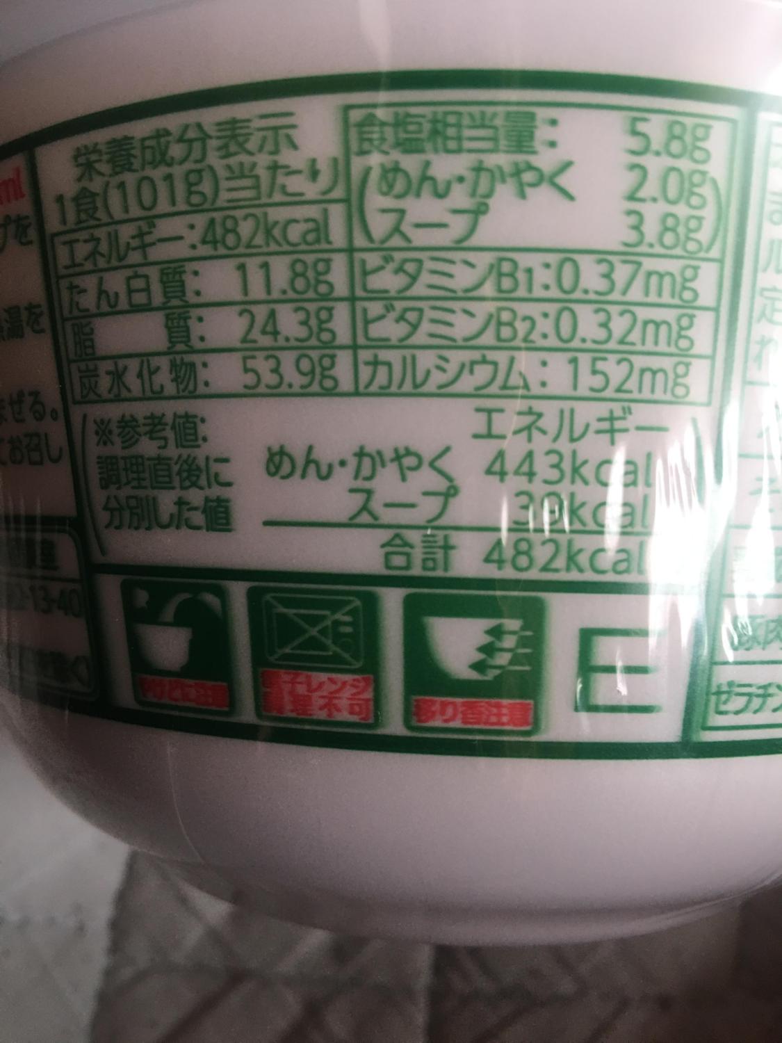 食品単位1食(101g)当たりエネルギー482kcalタンパク質11.8g脂質24.3g炭水化物53.9g食塩相当量5.8gビタミンB10.37mgビタミンB20.32mgカルシウム152mg詳細を見る