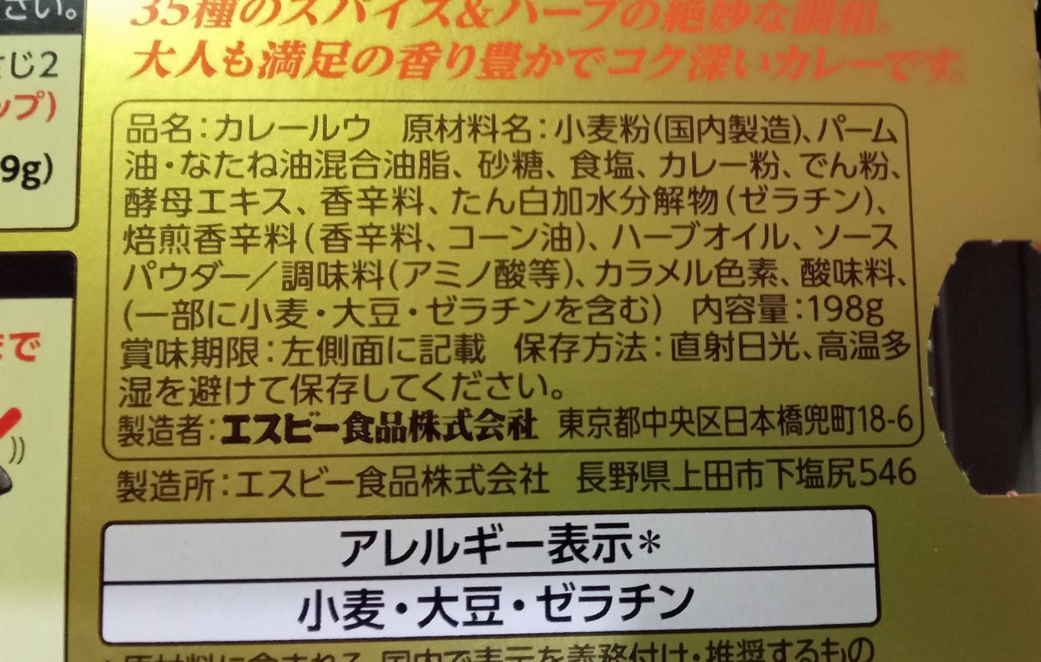 品名カレールウ原材料名小麦粉(国内製造)、パーム油、なたね油混合油脂、砂糖、食塩、カレー粉、でん粉、酵母エキス、香辛料、たん白加水分解物(ゼラチン)、焙煎香辛料(香辛料、コーン油)、ハーブオイル、ソースパウダー添加物調味料(アミノ酸等)、カラメル色素、酸味料内容量198g保存方法直射日光、高温多湿を避けて保存してください。製造者エスビー食品株式会社 東京都中央区日本橋兜町18-6製造所エスビー食品株式会社 長野県上田市下塩尻546アレルギー表示小麦、大豆、ゼラチン詳細を見る