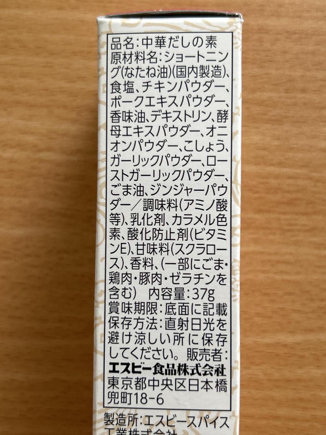 品名中華だしの素原材料名ショートニング(なたね油)(国内製造)、食塩、チキンパウダー、ポークエキスパウダー、香味油、デキストリン、酵母エキスパウダー、オニオンパウダー、こしょう、ガーリックパウダー、ローストガーリックパウダー、ごま油、ジンジャーパウダー添加物調味料(アミノ酸等)、乳化剤、カラメル色素、酸化防止剤(ビタミンE)、甘味料(スクラロース)、香料内容量37g保存方法直射日光を避け涼しい所に保存してください。販売者エスビー食品株式会社 東京都中央区日本橋兜町18-6製造所エスビースパイス工業株式会社詳細を見る