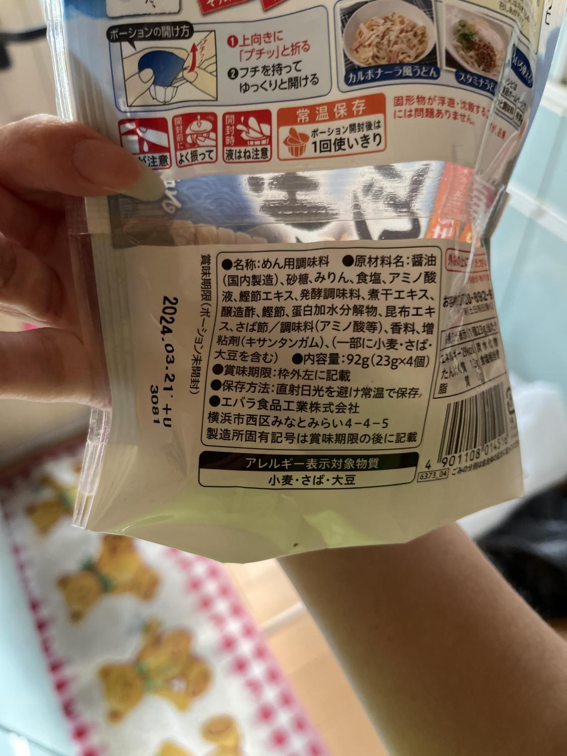 名称めん用調味料原材料名醤油(国内製造)、砂糖、みりん、食塩、アミノ酸液、鰹節エキス、発酵調味料、煮干エキス、醸造酢、鰹節、蛋白加水分解物、昆布エキス、さば節添加物調味料(アミノ酸等)、香料、増粘剤(キサンタンガム)内容量92g(23g×4個)賞味期限2024.03.21保存方法直射日光を避け常温で保存製造者エバラ食品工業株式会社製造者住所横浜市西区みなとみらい4-4-5アレルギー表示対象物質小麦、さば、大豆詳細を見る