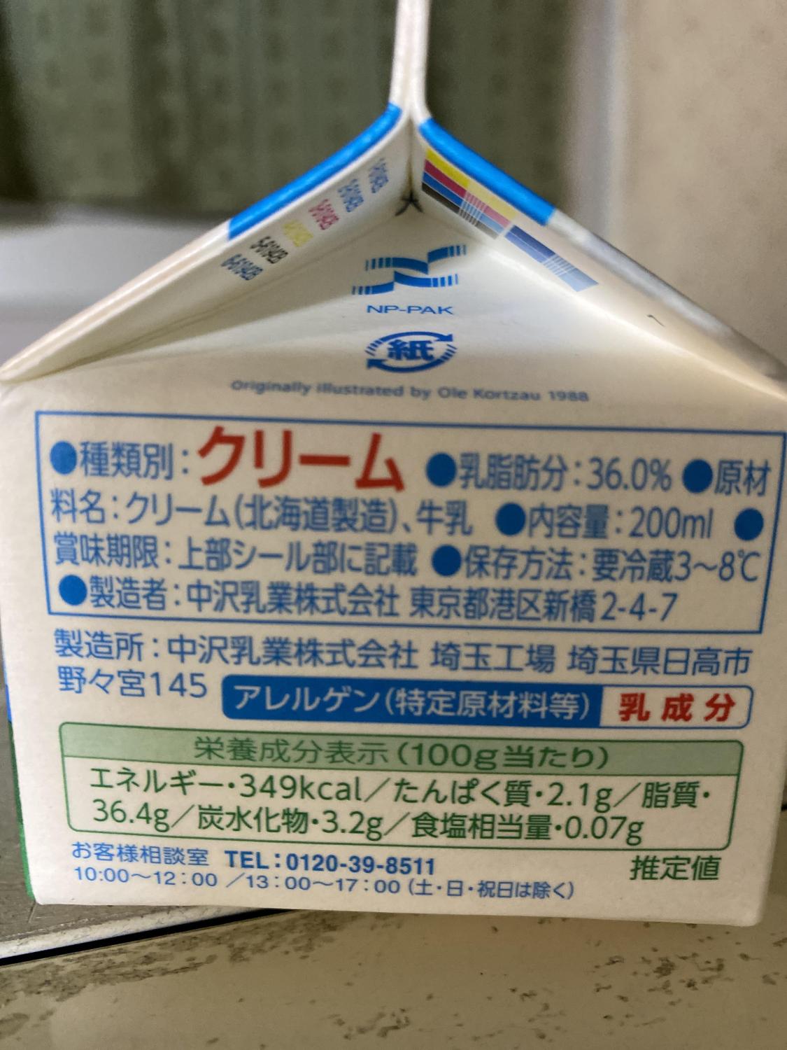 種類別クリーム乳脂肪分36.0%原材料名クリーム(北海道製造)、牛乳内容量200ml保存方法要冷蔵3~8℃製造者中沢乳業株式会社 東京都港区新橋2-4-7製造所中沢乳業株式会社 埼玉工場 埼玉県日高市野々宮145アレルゲン乳成分栄養成分表示349kcal、2.1g、36.4g、3.2g、0.07g詳細を見る