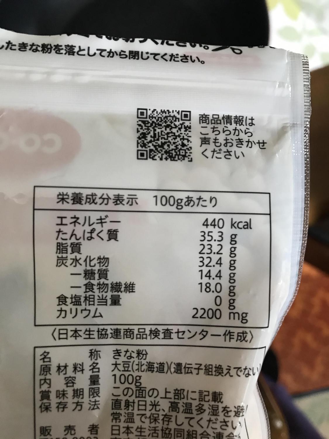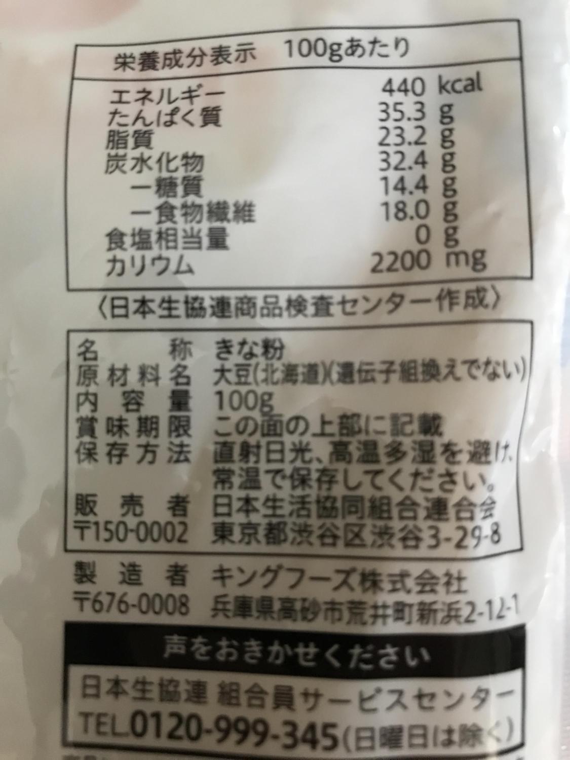 名称きな粉原材料名大豆(北海道)(遺伝子組換えでない)内容量100g栄養成分表示440kcal、35.3g、23.2g、32.4g、14.4g、18.0g、0g、2200mg詳細を見る
