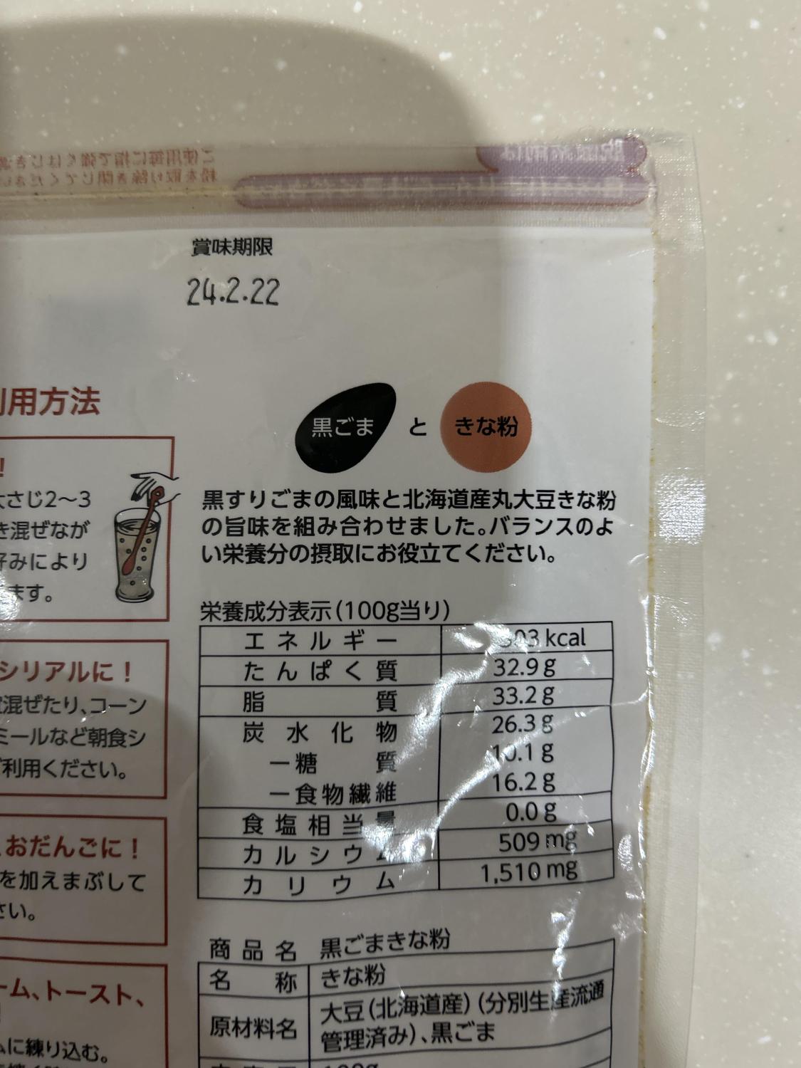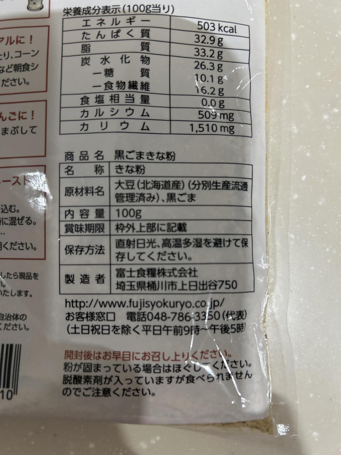 商品名黒ごまきな粉名称きな粉原材料名大豆 (北海道産) (分別生産流通管理済み)、黒ごま内容量100g栄養成分表示503kcal、32.9g、10.1g、33.2g、16.2g、0.0g、0.0g、509mg、1,510mg詳細を見る