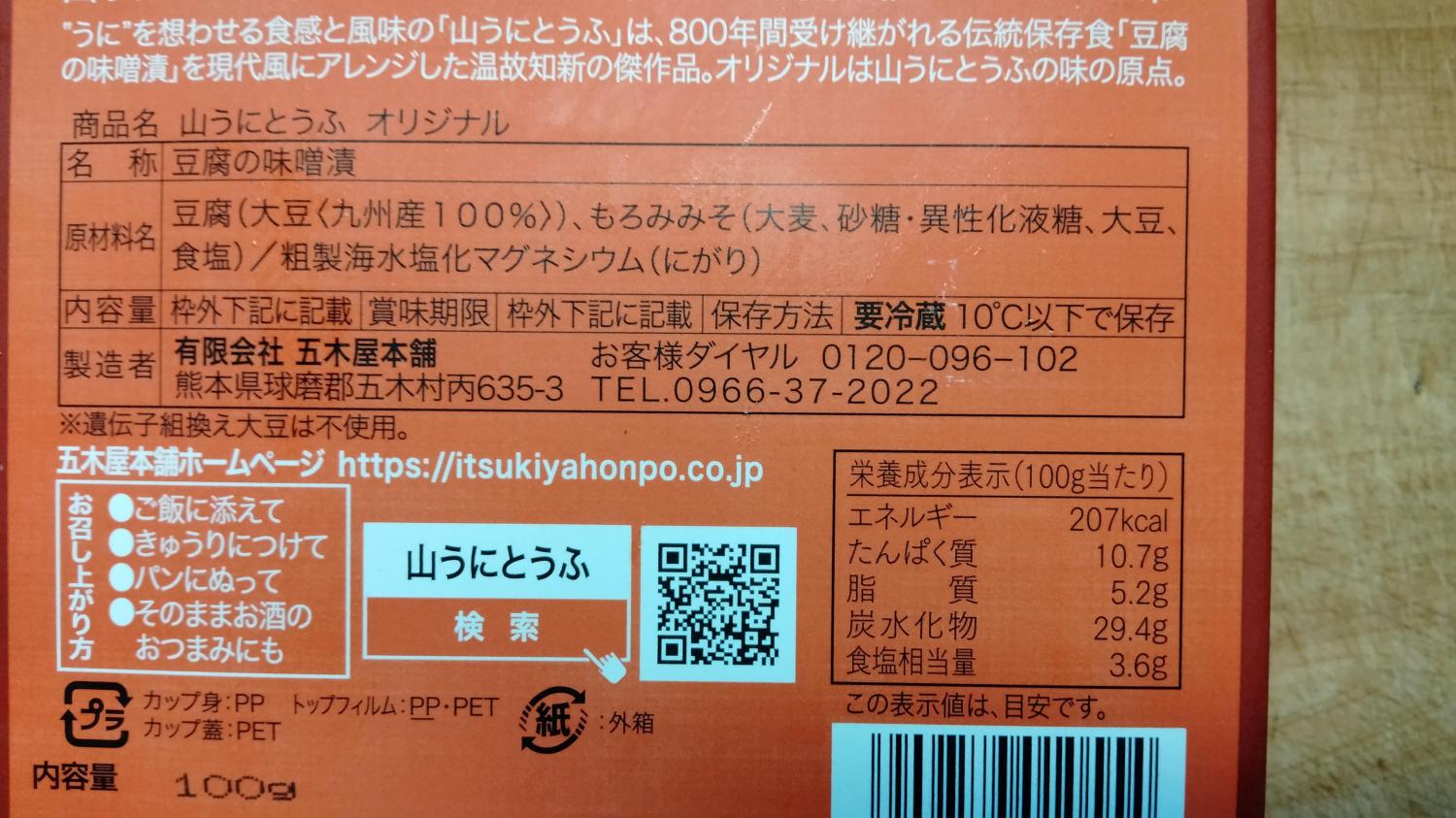 商品名山うにとうふ オリジナル名称豆腐の味噌漬原材料名豆腐(大豆〈九州産100%〉)、もろみみそ(大麦、砂糖・異性化液糖、大豆)、食塩、粗製海水塩化マグネシウム(にがり)製造者有限会社 五木屋本舗保存方法要冷蔵10℃以下で保存お客様ダイヤル0120-096-102住所熊本県球磨郡五木村丙635-3TEL0966-37-2022栄養成分表示(100g当たり)207kcal、10.7g、5.2g、29.4g、3.6g内容量100g注意点遺伝子組換え大豆は不使用詳細を見る