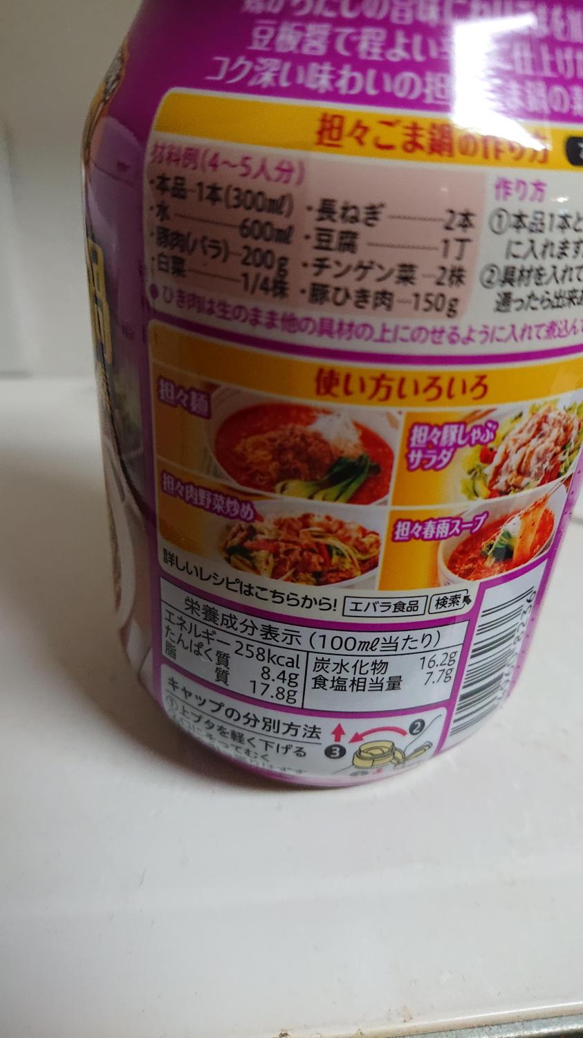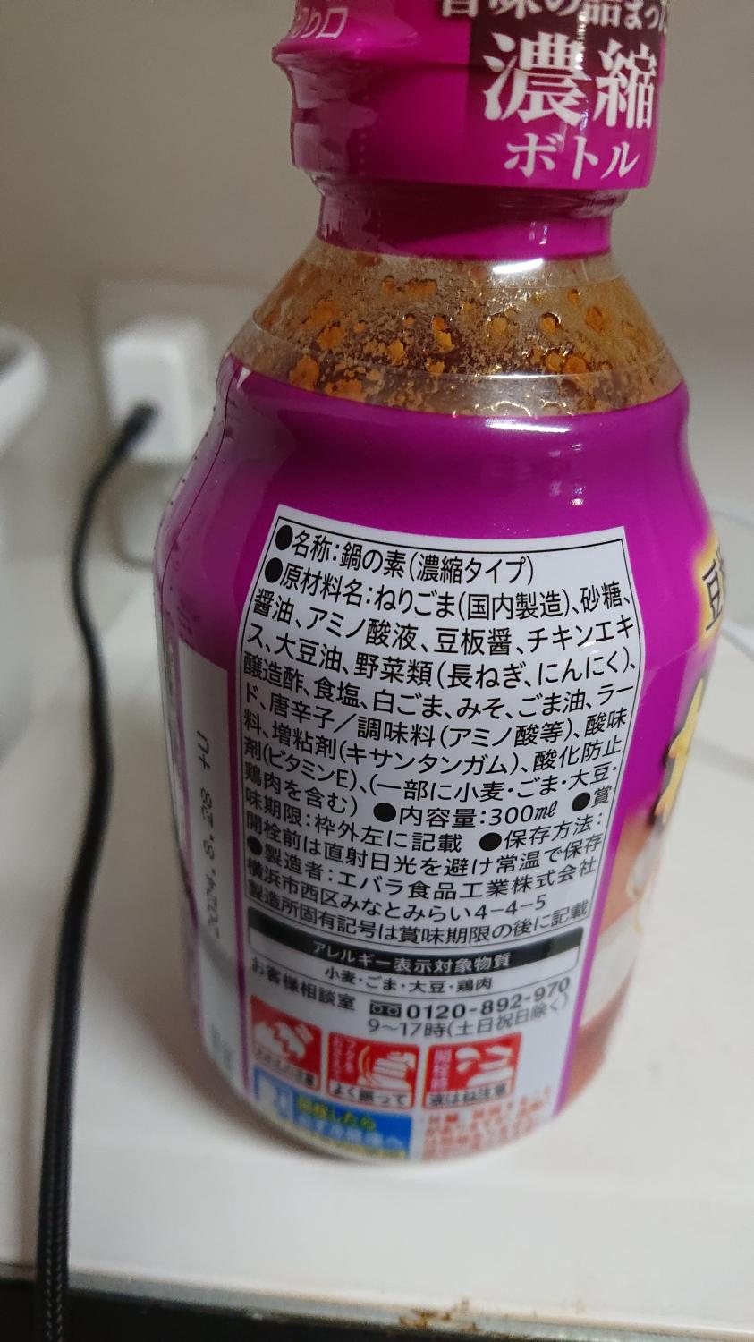 名称鍋の素(濃縮タイプ)原材料名ねりごま(国内製造)、砂糖、醤油、アミノ酸液、豆板醤、チキンエキス、大豆油、野菜類(長ねぎ、にんにく)、醸造酢、食塩、白ごま、みそ、ごま油、ラード、唐辛子添加物調味料(アミノ酸等)、酸味料、増粘剤(キサンタンガム)、酸化防止剤(ビタミンE)内容量300ml保存方法開栓前は直射日光を避け常温で保存製造者エバラ食品工業株式会社アレルギー表示対象物質小麦、ごま、大豆、鶏肉詳細を見る