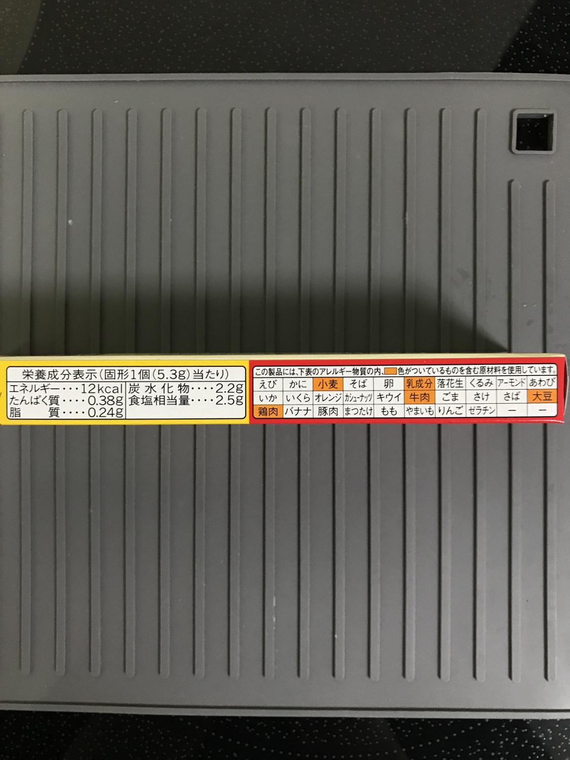 食品単位固形1個 (5.3g)当たりエネルギー12kcalタンパク質0.38g脂質0g食塩相当量2.5g炭水化物2.2g詳細を見る