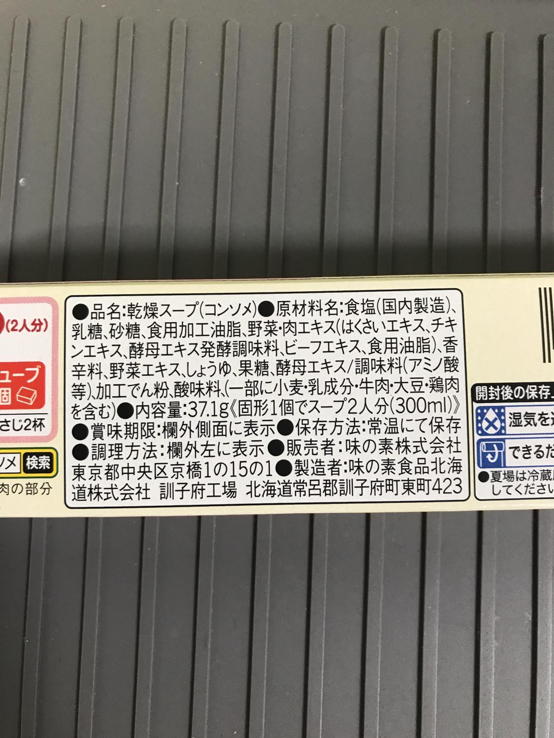 品名乾燥スープ(コンソメ)原材料名食塩(国内製造)、乳糖、砂糖、食用加工油脂、野菜・肉エキス(はくさいエキス、チキンエキス、酵母エキス発酵調味料、ビーフエキス、食用油脂)、香辛料、野菜エキス、しょうゆ、果糖、酵母エキス添加物調味料(アミノ酸等)、加工でん粉、酸味料内容量37.1gアレルゲン小麦、乳成分、牛肉、大豆、鶏肉販売者味の素株式会社製造者味の素食品北海道株式会社 訓子府工場詳細を見る